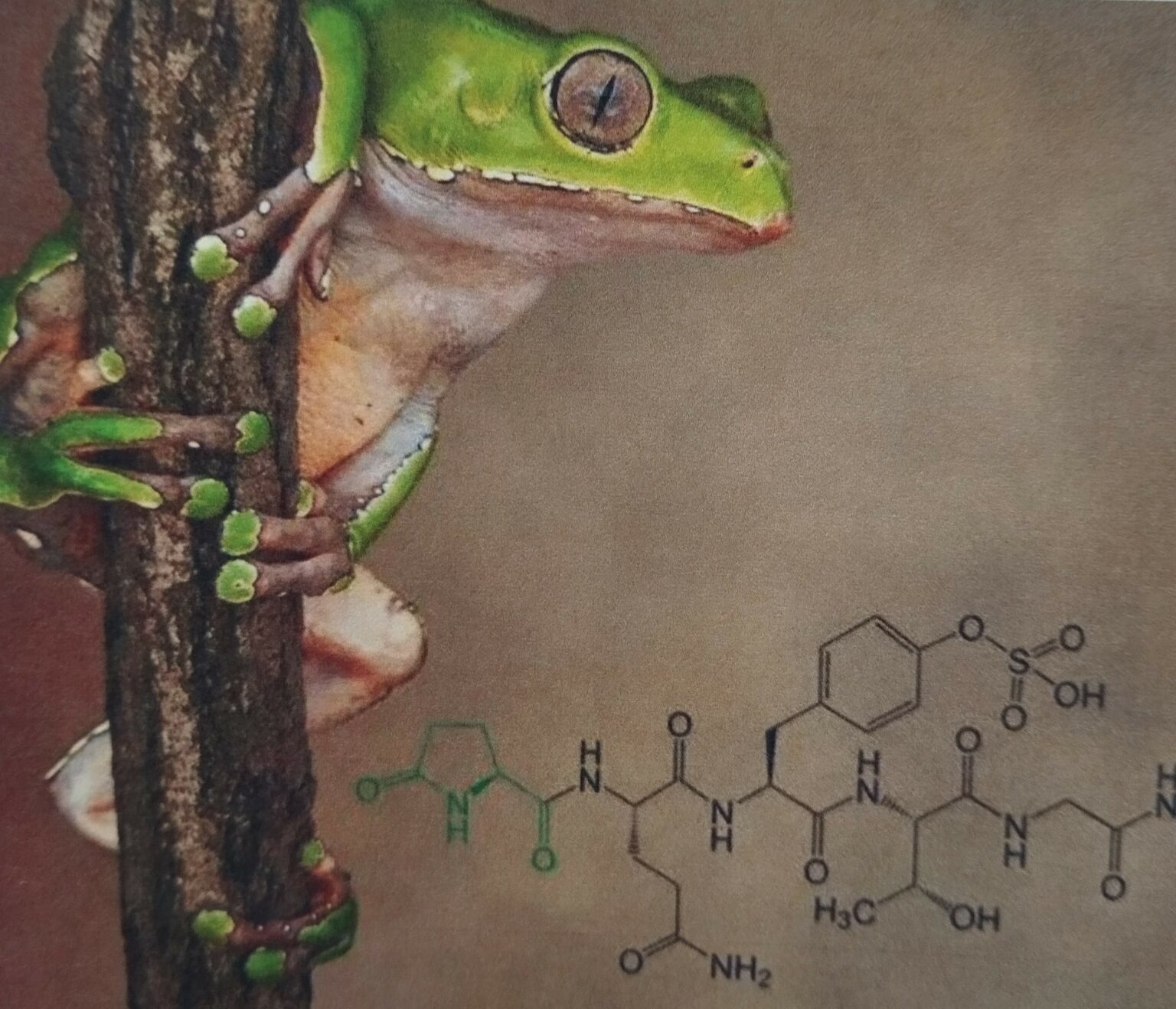 La grenouille rainette géante, nommée Phyllomedusa bicolor, vit dans la haute forêt amazonienne. Sans prédateurs naturels, elle se caractérise par les propriétés biomédicinales de ses sécrétions riches en peptides bioactifs dont plusieurs ont été identifiés scientifiquement (phyllokinin, phyllomedusin, sauvagine, dermaseptins, caerulein, dermophin, deltorphin …). Ces peptides sont connus pour plusieurs propriétés bioactives curatives et réputées bénéfiques pour le système immunitaire, la santé, la clarté, la force, l’énergie physique, émotionnelle et mentale.