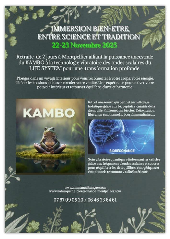Kambo, ou Sapo, désigne ainsi cette sécrétion naturelle non psychoactive aux propriétés exceptionnelles de nettoyage holistique du corps. Notons par ailleurs que le kambo n’est pas la seule sécrétion du règne animal ou végétal ayant des propriétés bénéfiques. Ses nombreuses propriétés sont notamment : antibactériennes, antifongiques, antimicrobiennes, antivirales, antiparasitaires, antiinflammatoires, résistance au stress, libération émotionnelle, boost énergétique et immunitaire …
