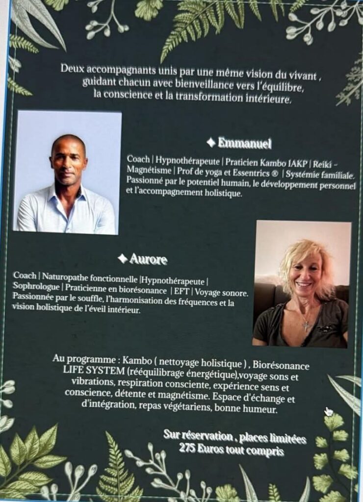 Une cérémonie KAMBO organisée par mes soins respecte l’exigence et les règles de l’Association internationale des praticiens kambo (IAKP). Par ailleurs, le kambo comporte des contre-indications, et ne se substitue en aucun cas à tout traitement médical.